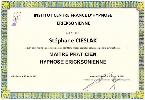 Pour cela je me suis formé à l’hypnose ericksonienne avec l’ICFHE (Institut Centre France d’Hypnose Ericksonienne) où j’ai atteint le diplôme de Maitre patricien.